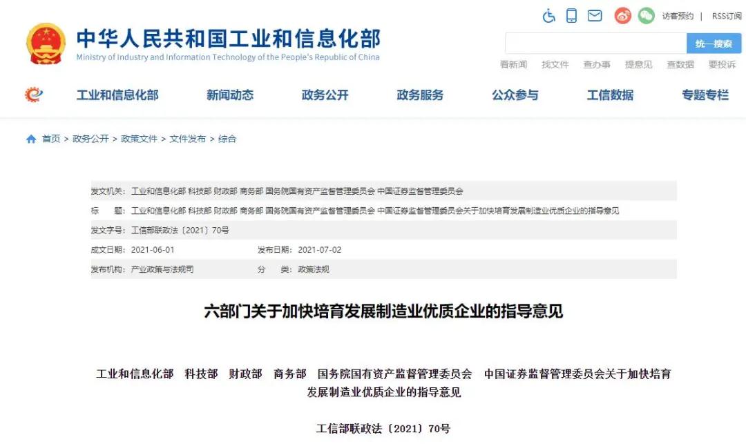 日前,工信部、科技部等六部门联合印发《关于加快培育发展制造业优质企业的指导意见》,提出准确把握培育发展优质企业的总体要求、构建优质企业梯度培育格局、提高优质企业自主创新能力、促进提升产业链供应链现代化水平等10个方面指导意见。